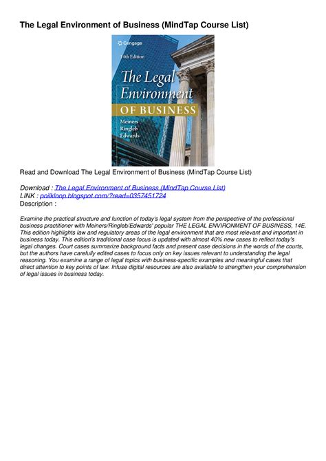 Download The Legal Environment of Business MindTap Course List Epub By Click Button. The Legal Environment of Business MindTap Course List it’s easy to recommend a new book category such as Novel, journal, comic, magazin, ect. You see it and you just know that the designer is also an author and understands the challenges involved with having a good book. You can easy klick for detailing book and you can read it online, even you can download it